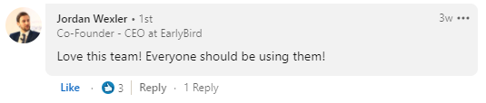EarlyBird’s Co-founder and CEO, Jordan Wexler, had some nice, unprompted words to say about our collaboration: