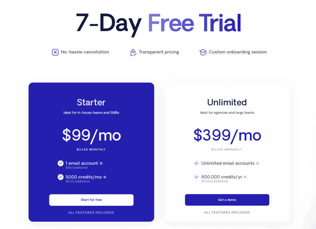 Respona offers a 7-day free trial and two base plans: Starter ($99/month) and Unlimited ($499/month):