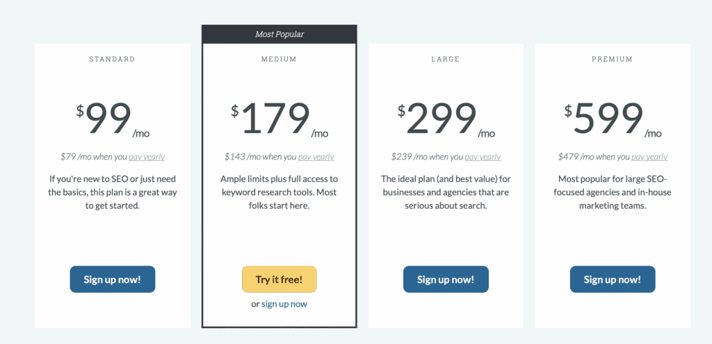 MozBar is a free tool, but most of its features are limited. If you’re looking for additional features like rank tracking and more backlink data, you can also sign up for Moz Pro with the following plans: