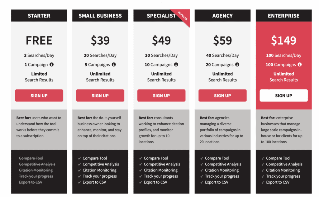 Whitespark offers a number of premium plans depending on your needs. These give you extra features like the ability to track citations and get unlimited search results.