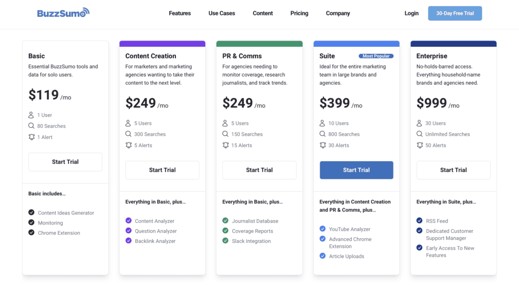 BuzzSumo offers a free 30-day trial. But if you want to keep using their software, you’ll need to upgrade to one of their paid plans which starts at $99 a month.