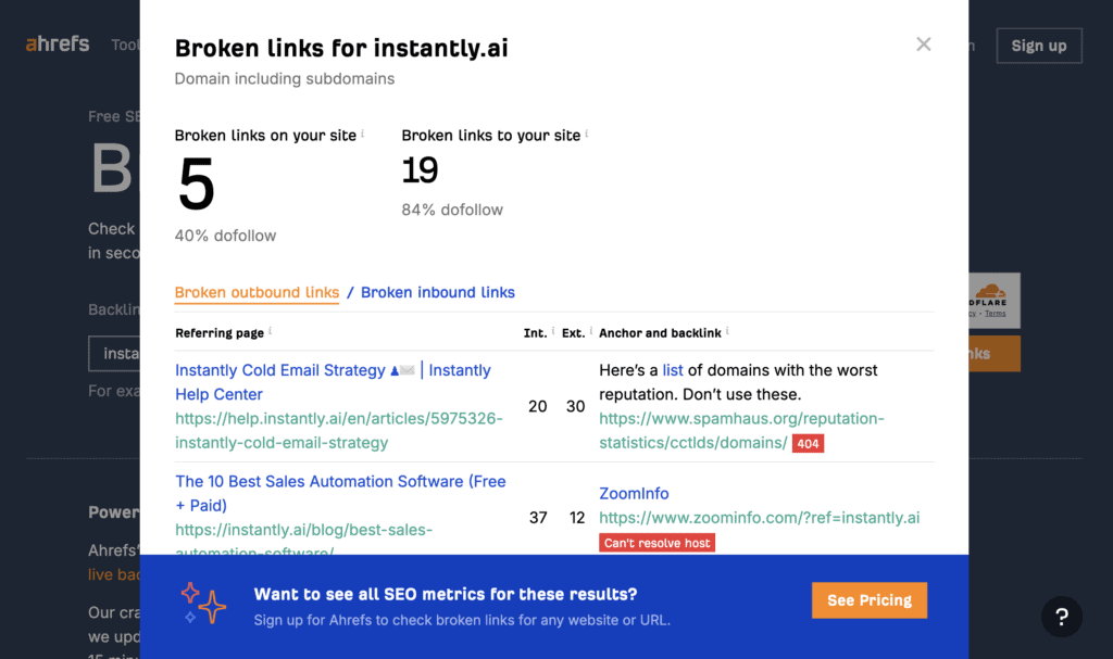 Ahrefs’ link building tool only shows a portion of broken backlinks. You’ll need to subscribe to one of their premium plans to see all the link data. The good news is that you get access to their other tools too.