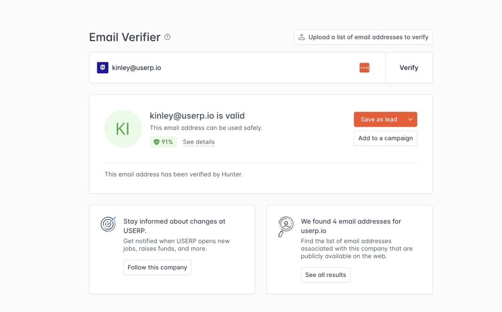 Another handy feature that Hunter.io offers is email verification (as seen by the green checkmarks above). This tells you that an email is active and in use.