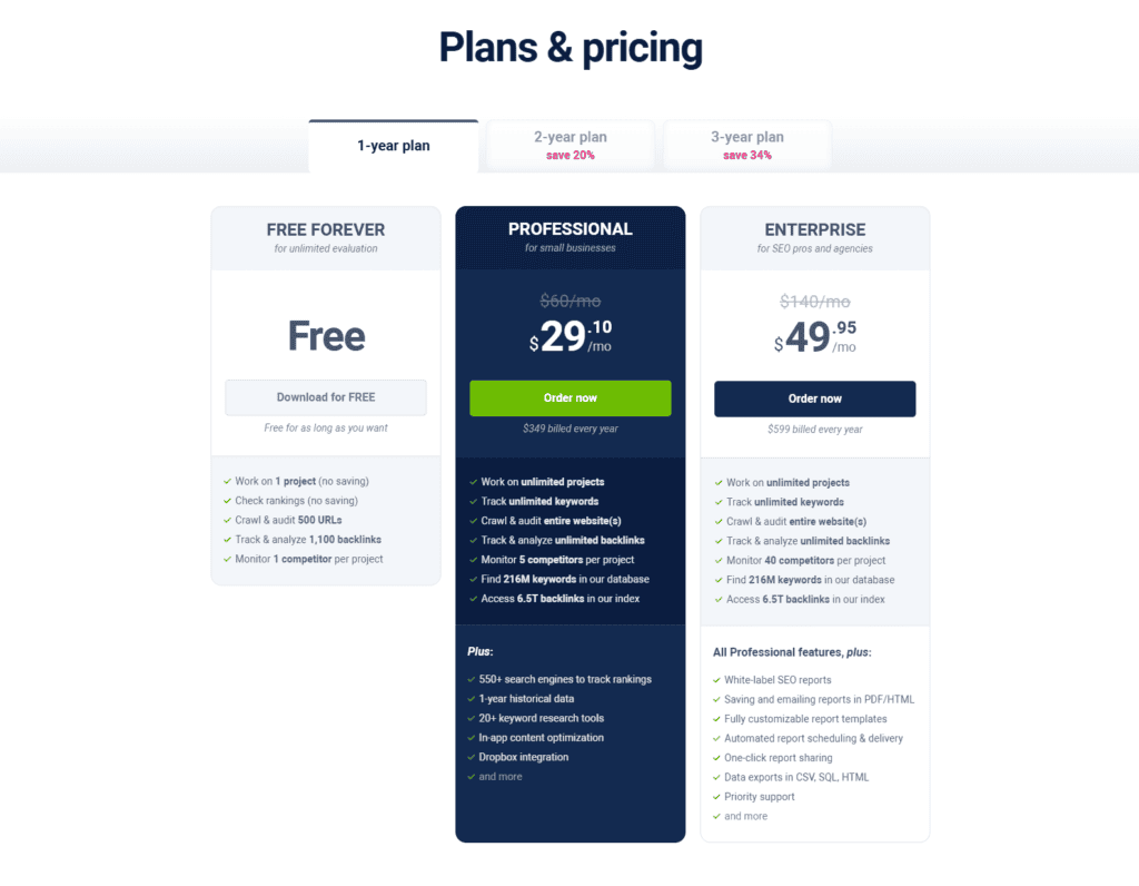 The Professional version of SEO SpyGlass costs $345/year and Enterprise costs $599/year. The price is cheaper if ordering the whole SEO PowerSuite bundle.