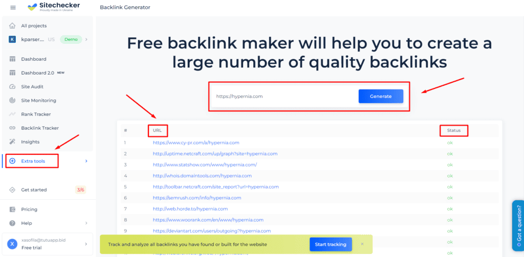 Backlinks Generator is especially recommended for newly created projects: it generates the first URLs for landing pages in a few seconds. It is recommended to use the tool with other similar services from Sitechecker: Backlinks Checker to identify links built naturally and Backlinks Tracker to understand which links have the best impact on ranking growth.