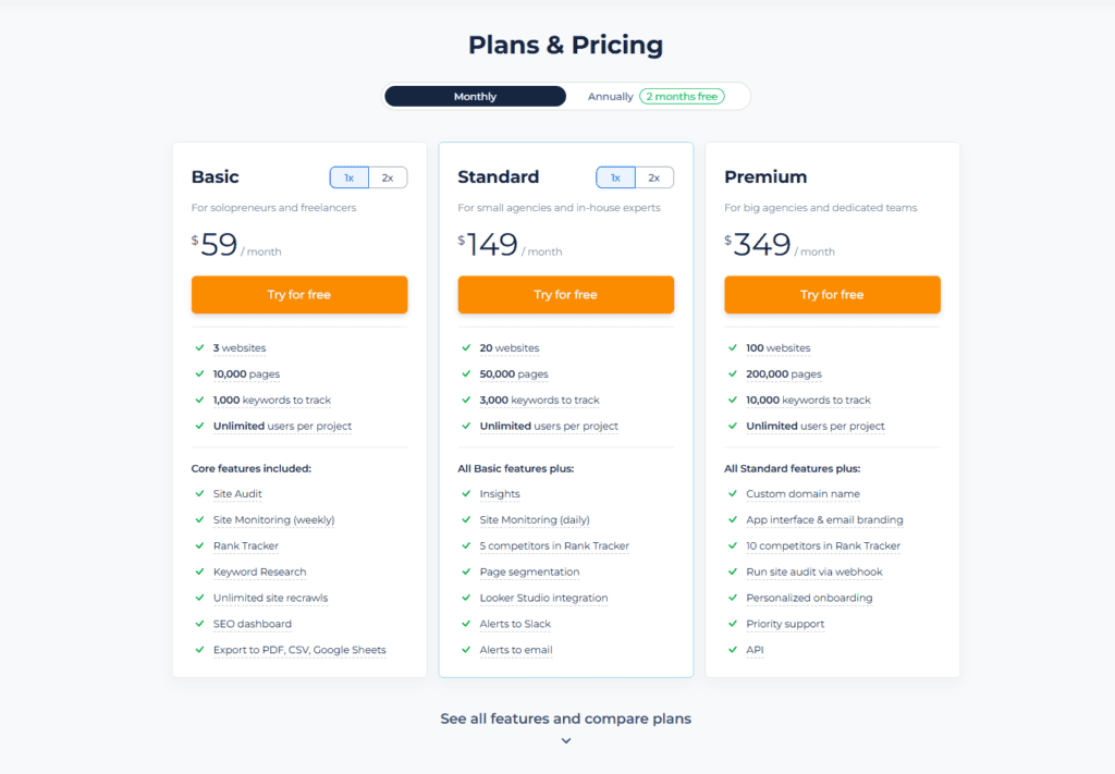 Backlink Analysis and Backlinks Generator are included in Sitechecker’s product range and are available on three pricing plans. Pricing starts at $49 per month, with maximum features available starting at $249 per month. You can save a lot by purchasing an annual plan.
