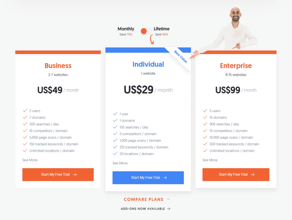 You’ll also get access to a complete SEO toolkit that includes tools for ranking tracking, keywords and competitive research, website audit, backlink monitoring, and more.