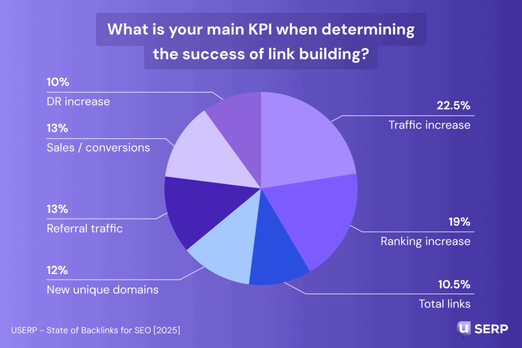 22.5% of respondents look at overall traffic increase as a main KPI when measuring the effectiveness of a link. This was followed by 19% who look at organic rankings.