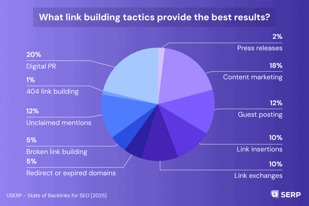 The most popular link building strategies — digital PR and content marketing — also delivered the strongest results. Publishing quality content and pitching it remains an effective way to earn links.