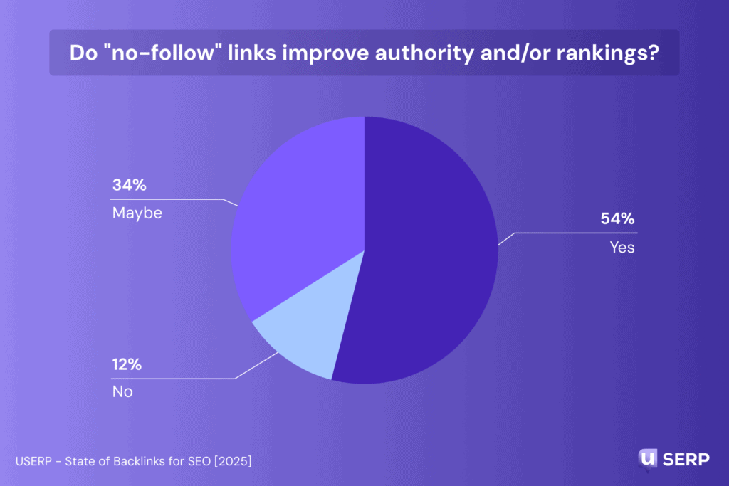 More than half of participants in our survey (54%) indicated that nofollow links improve authority and/or rankings, while 34% said these links might have an impact, but weren’t fully confident in comparison to followed backlinks.