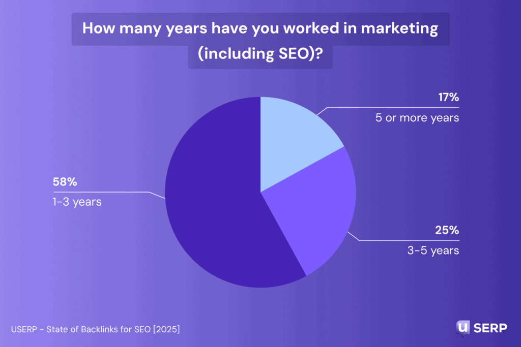 58% of respondents indicated they’ve been in the industry for 1 to 3 years. This was followed by 25% who have worked in digital marketing for 3 to 5 years and 17% who have been in the industry for 5 or more years (SEO specific).