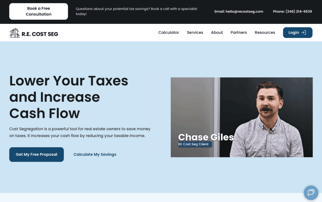 More importantly, this tactic contributes to the relatability of the content on the brand’s homepage. This enables RE Cost Seg to prove to first-time web visitors that it is the right address for resolving their real estate cash flow pain points.