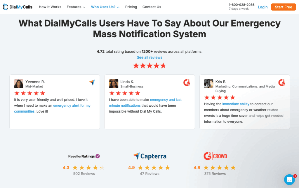 For example, check out how DialMyCalls incorporates this strategy into its Emergency Mass Notification page. On the one hand, the online reviews and ratings testify to the brand’s competence at resolving a specific customer pain point. On the other hand, all the social proof elements are clickable, making it easy for prospects to check their validity.