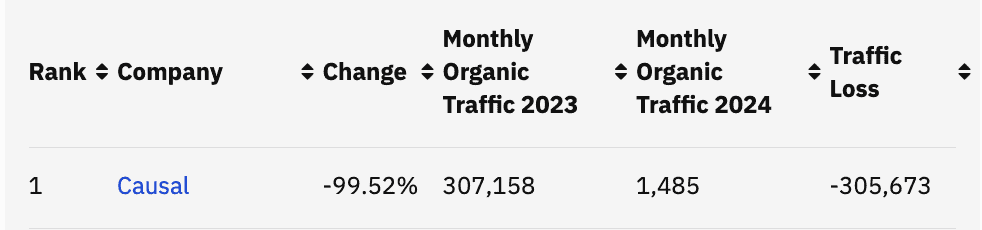 Casual, a finance platform for startups, saw a 99.52% decrease in organic traffic. It received a Google manual penalty. This happens when Google’s webspam team detects a website violating its Search Essentials.