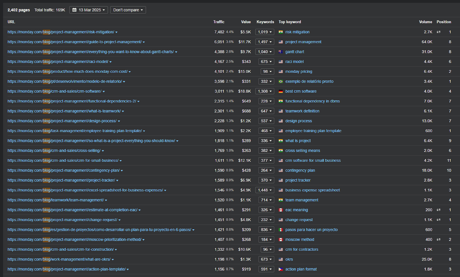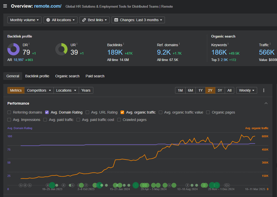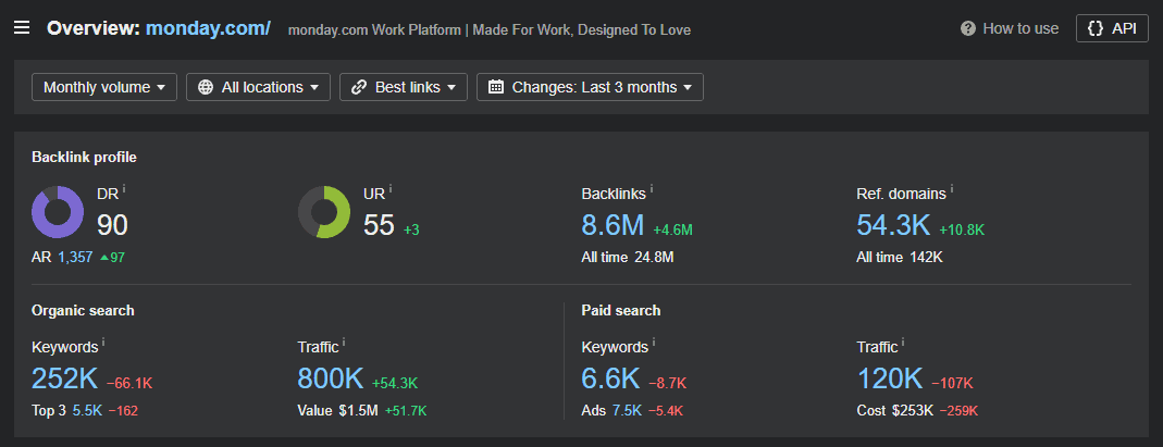 When we first started working with Monday.com, they were bringing in nearly 700k organic visitors per month. That’s strong by any standard, but they were leaving a ton of performance on the table due to a weak backlink profile made up mostly of mid-tier links.