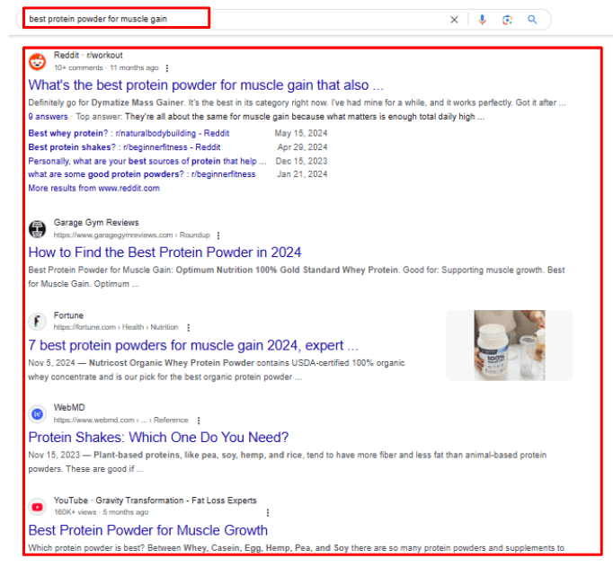 On the other hand, ‘best protein powder for muscle gain’ often brings up blogs and product reviews: