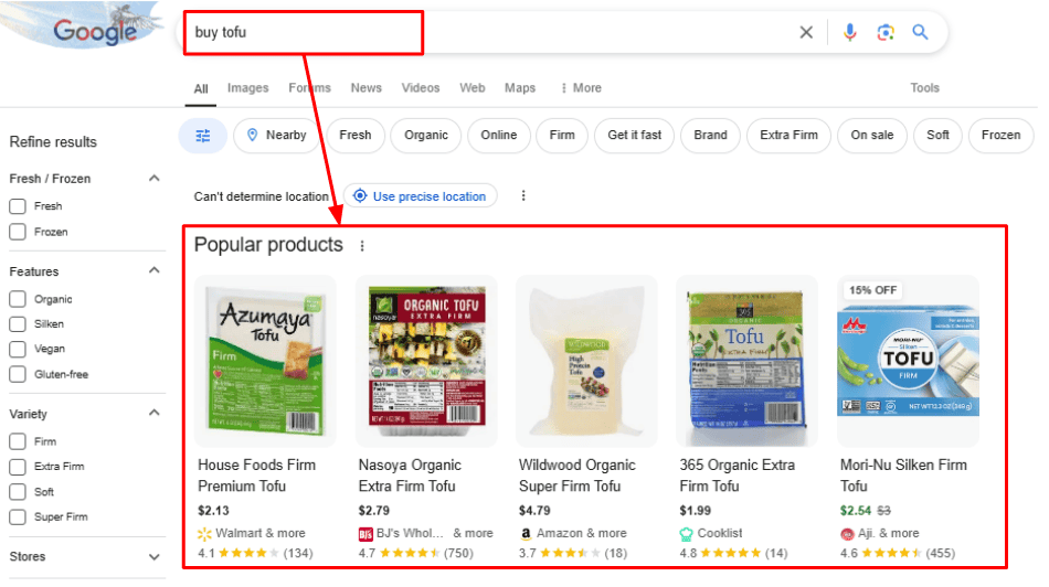 On the other hand, if you search “buy tofu,” the top results are eCommerce pages and product ads: