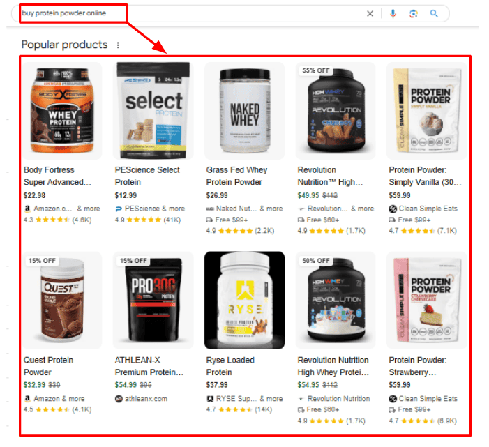 For instance, searching ‘buy protein powder online’ returns eCommerce product pages: