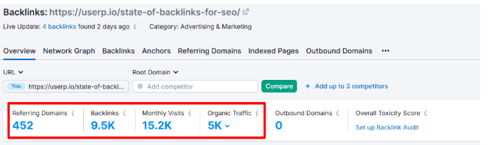 Semrush’s Backlink Analytics tool shows that this specific page has 9.5k links from 452 referring domains and receives an impressive 15.2k monthly visits.