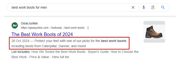 Meta descriptions might not directly affect rankings on SERPs, but Google generates snippets based on them. Like title tags, they influence users’ decisions to click on your page, boosting your CTR.