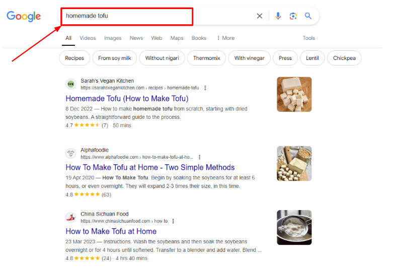 A search for “homemade tofu” returns recipes and videos because users want to make tofu at home, not buy it. However, searching “buy tofu” delivers eCommerce pages and product ads instead.